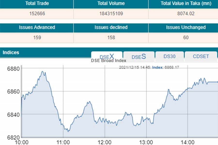 DSEX, the prime index of the Dhaka Stock Exchange (DSE), went up by 30.36 points or 0.44 per cent to settle at 6,868, after losing 147 points in the past three consecutive sessions.