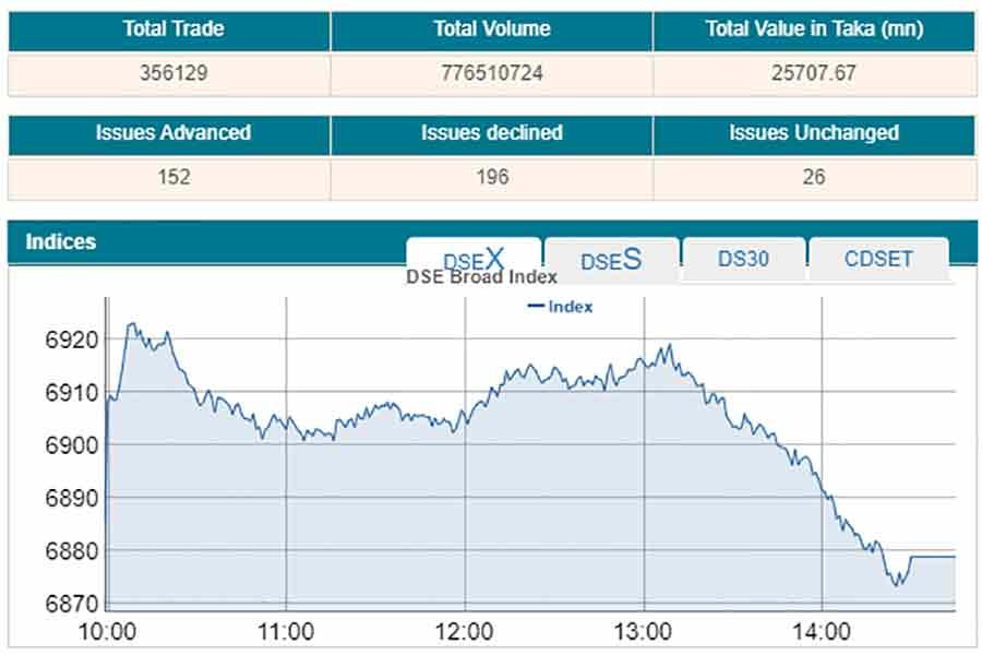 At the end of the session, DSEX, the key index of the Dhaka Stock Exchange (DSE), went down by 5.92 points or 0.08 per cent to settle at 6,878, after gaining 124 points in the past three straight sessions.