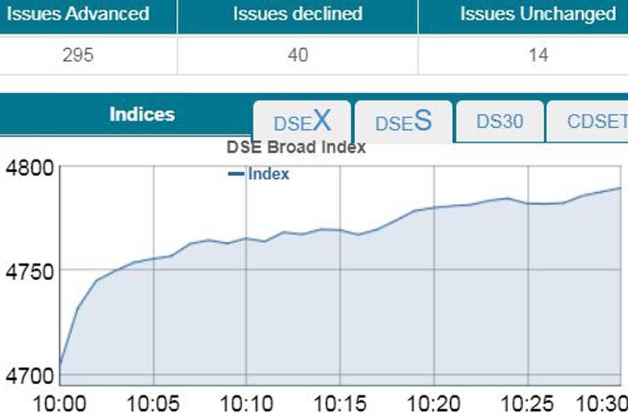 DSEX, the prime index of the DSE, went up by 84.53 points or 1.79 per cent to reach at 4,787 points at 10:30 am.