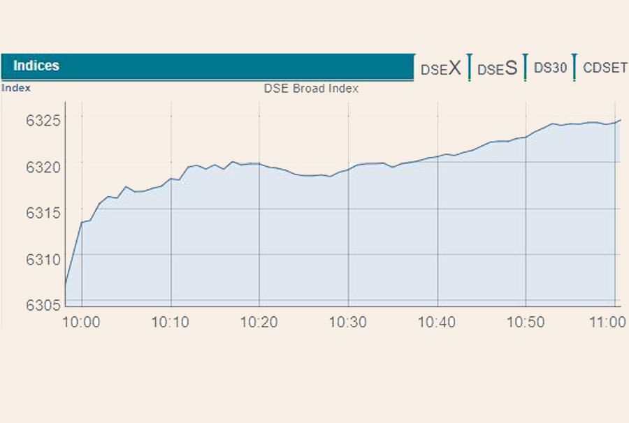 Following the previous day's upbeat note, the market soared at the opening and the benchmark index of the Dhaka Stock Exchange (DSE), went up by 18.70 points or 0.30 per cent to stand at 6,324 within the first hour of trading when the report was filed at 11:00 am.