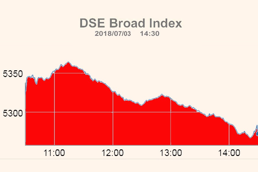 At the end of the session DSEX, the prime index of the Dhaka Stock Exchange (DSE), went down by 49.24 points or 0.92 per cent to come down below 5,300-mark to settle at 5,273.