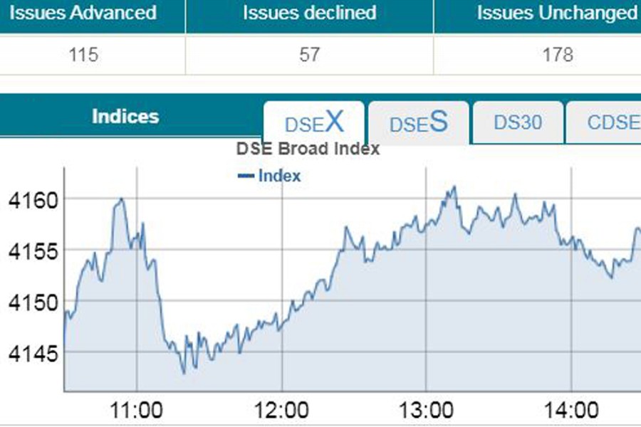 DSEX, the key index of the Dhaka Stock Exchange, went up by 11.16 points or 0.26 per cent to settle at 4,156 during the four hours trading.