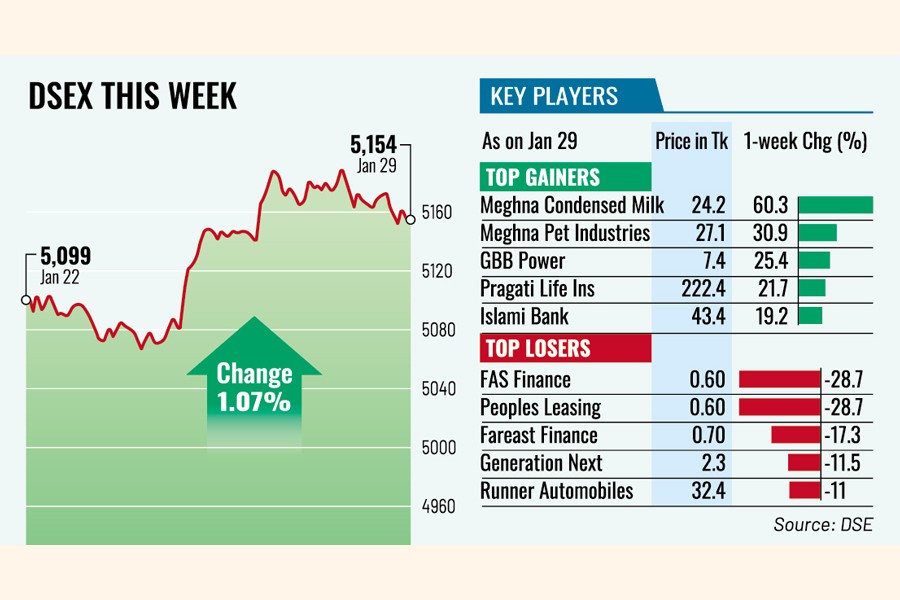 The prime DSEX index finally settled the week nearly 55 points or 1.07 per cent higher at 5,154. Over the past two weeks, the DSEX has gained a total of 195 points.