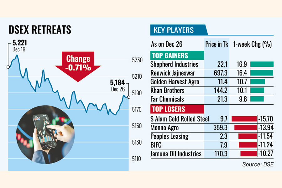 DSEX, the key index of the Dhaka Stock Exchange (DSE), settled the week more than 37 points or 0.71 per cent lower at 5,184, after gaining 116 points in the week before.