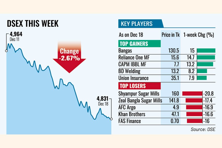The prime index of the Dhaka Stock Exchange (DSE) finally settled the week 132 points or 2.67 per cent lower at 4,831, after recovering 77 points in the week before.