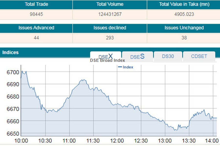 Along with sluggish turnover, DSEX, the key index of the DSE, went down by 31.81 points or 0.47 per cent to settle at 6,662. DSEX lost over 109 points in the past three straight sessions.