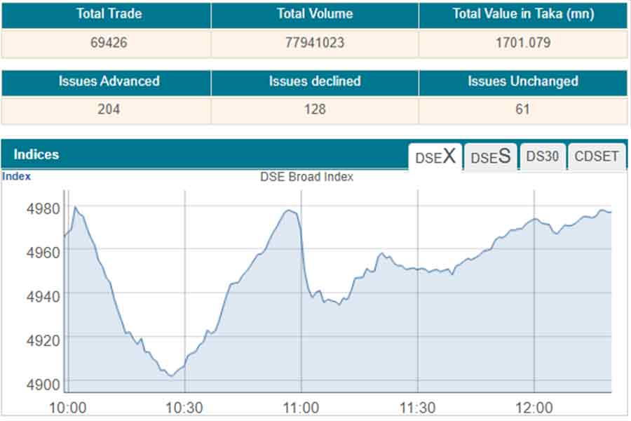After the first two hours of trading, the prime index of the Dhaka Stock Exchange (DSE), went up by 7 points or 0.15 per cent to 4,973 at 12:00 noon, when the report was filed.