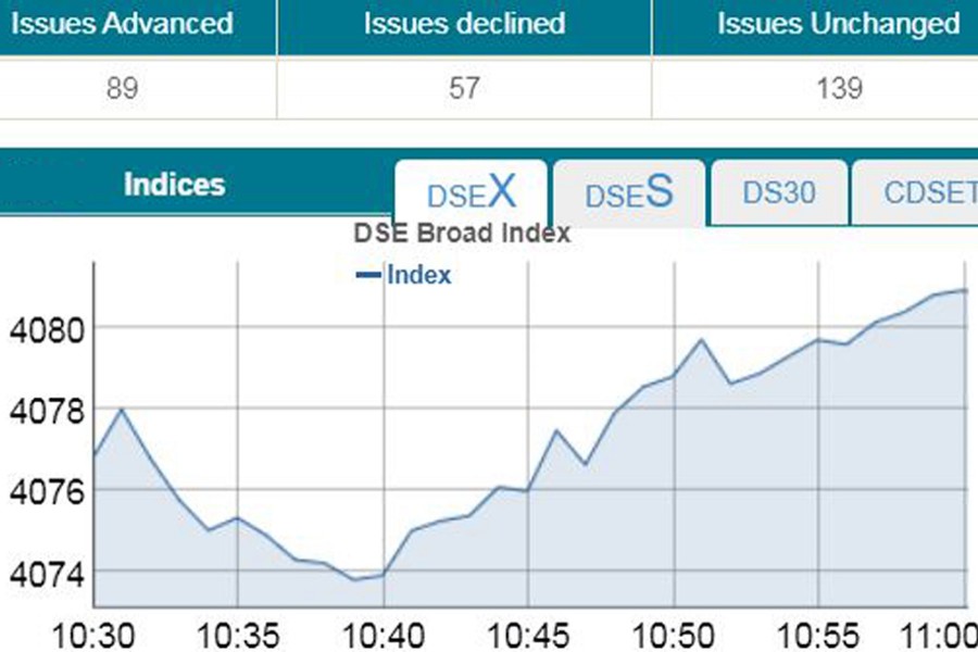 DSEX, the prime index of the DSE, went up by 4.05 points or 0.10 per cent to stand 4,080 points at 11:00am.