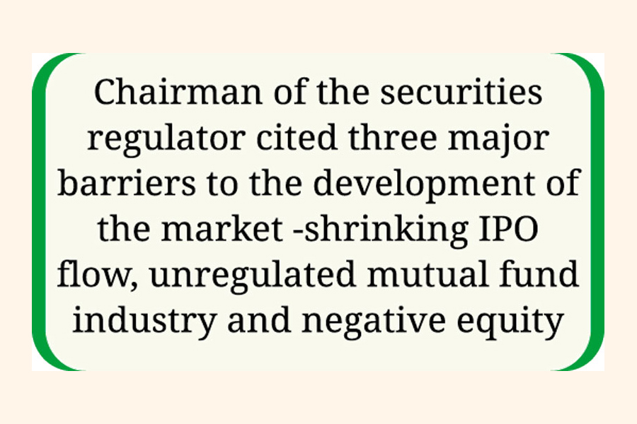 In a meeting with the Chartered Financial Analyst Society on Wednesday, the chairman of the securities regulator cited three major barriers to the development of the market - the shrinking IPO (initial public offering) flow, unregulated mutual fund industry and negative equity.