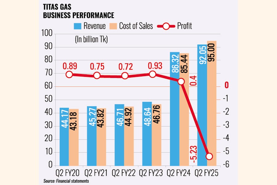 Titas Gas Transmission has reported a loss of Tk 5.23 billion for the second quarter through December of FY25. In the same quarter last year, it earned a profit of Tk 0.40 billion.