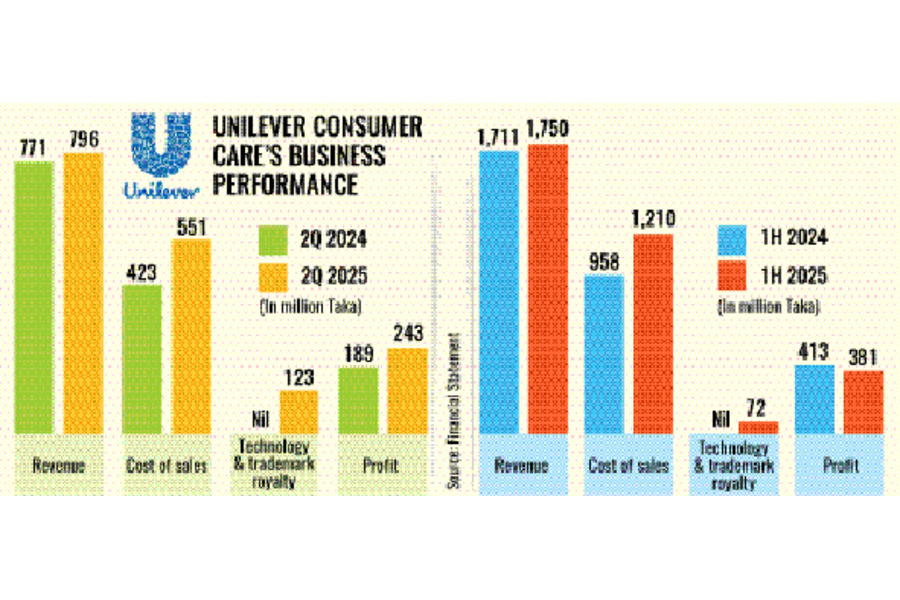Unilever reported a 3.27 per cent year-on-year growth in revenue to Tk 796 million in Q2 this year. It had witnessed a 14 per cent year-on-year fall in revenue to Tk 3.38 billion in 2024 because of double digit inflation that reduced people's purchase capacity.