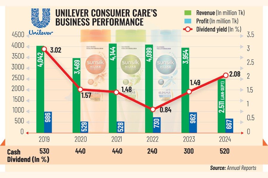 Despite a 31 per cent year-on-year decline in profit in 2024, Unilever Consumer Care recommended the highest dividend - 520 per cent -- in five years for shareholders for the year.