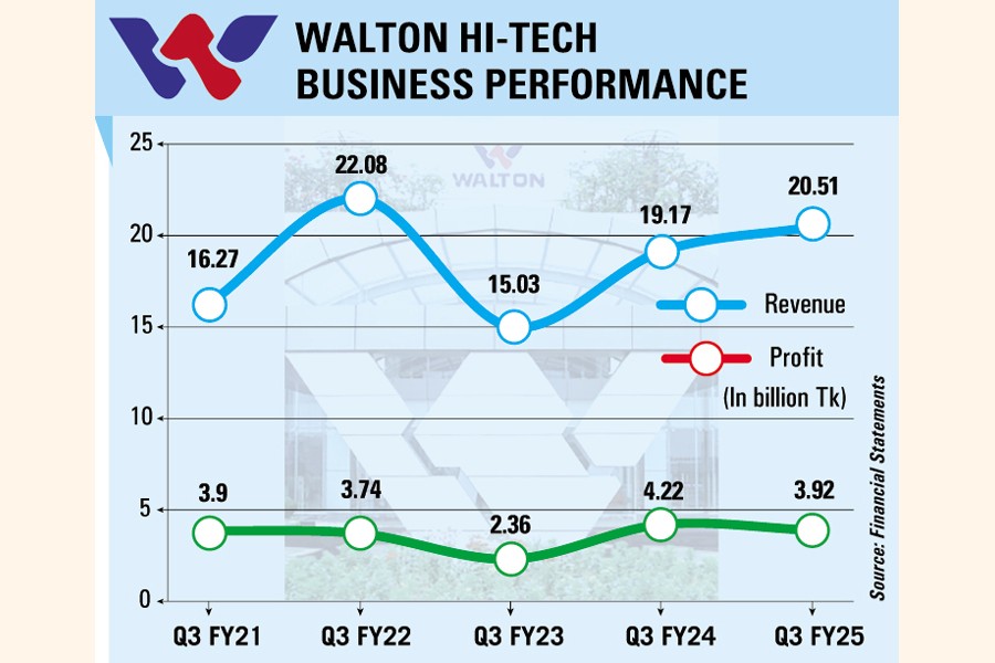 Despite higher sales, Walton Hi-Tech Industries' profit dropped 7.10 per cent year-on-year to Tk 3.92 billion in the third quarter of FY25, thanks to higher finance costs.