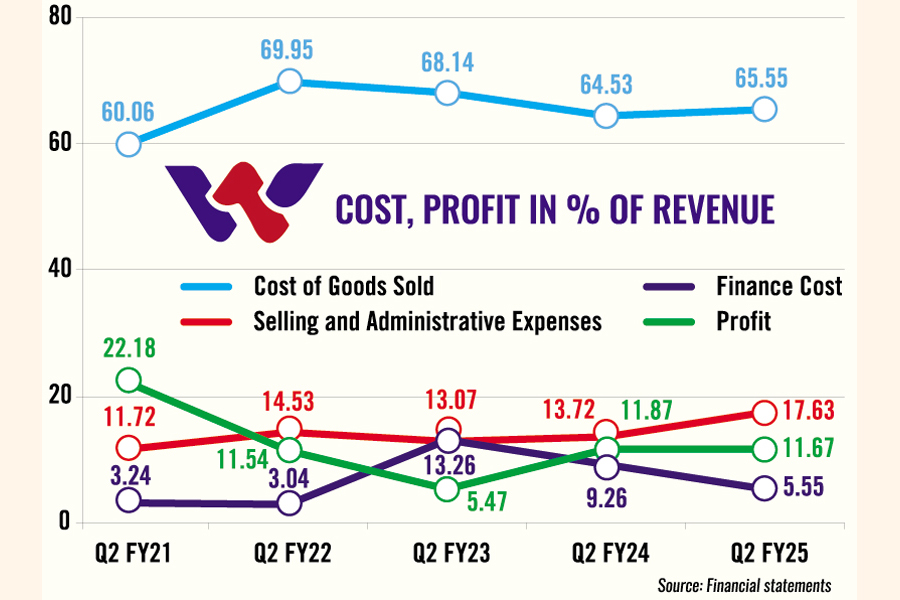 Walton spent Tk 65.55 in cost of goods sold per Tk 100 revenue earned in Q2 of FY25, which was Tk 64.53 a year ago.