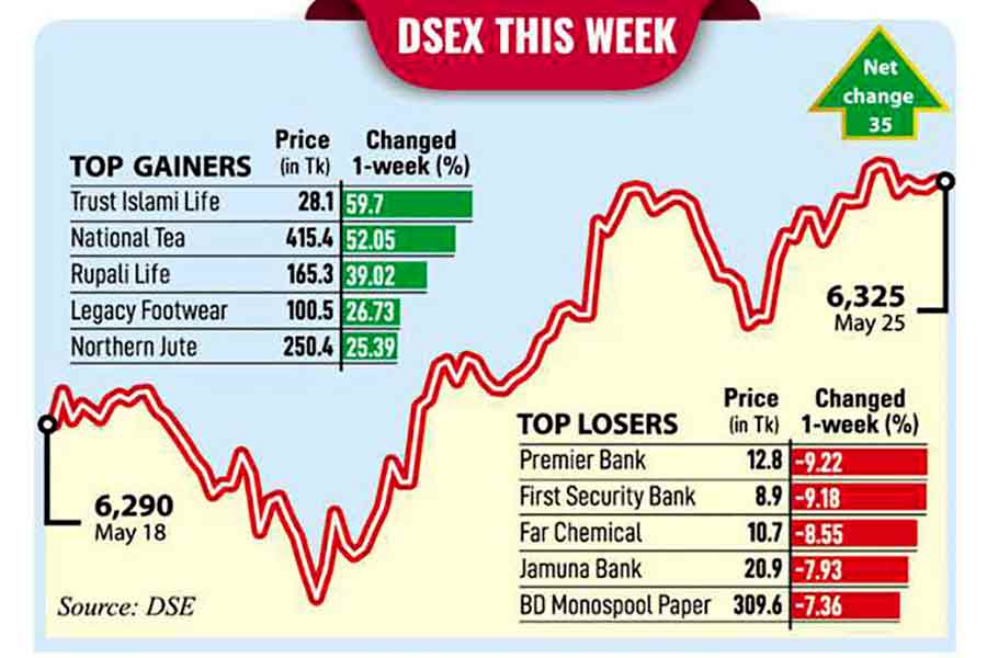 DSEX, the benchmark index of the Dhaka Stock Exchange (DSE), ultimately went up by 35.54 points or 0.56 per cent to settle the week at 6,325.73, the highest since November 10 last year. The DSEX added almost 57 points in the past three weeks.