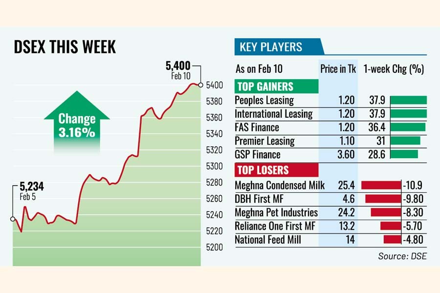 As a result, the benchmark DSEX index settled the week 166 points, or 3.16 per cent, higher at nearly 5,400.