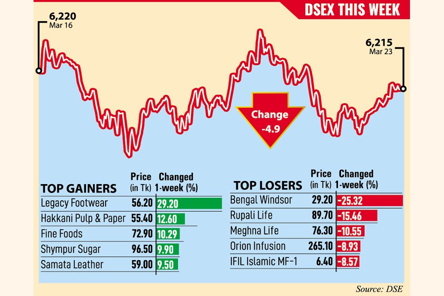 The DSEX, the prime index of Dhaka Stock Exchange (DSE), went down 4.94 points or 0.08 per cent to 6,215.30. The DSEX shed 45 points in the past two weeks.