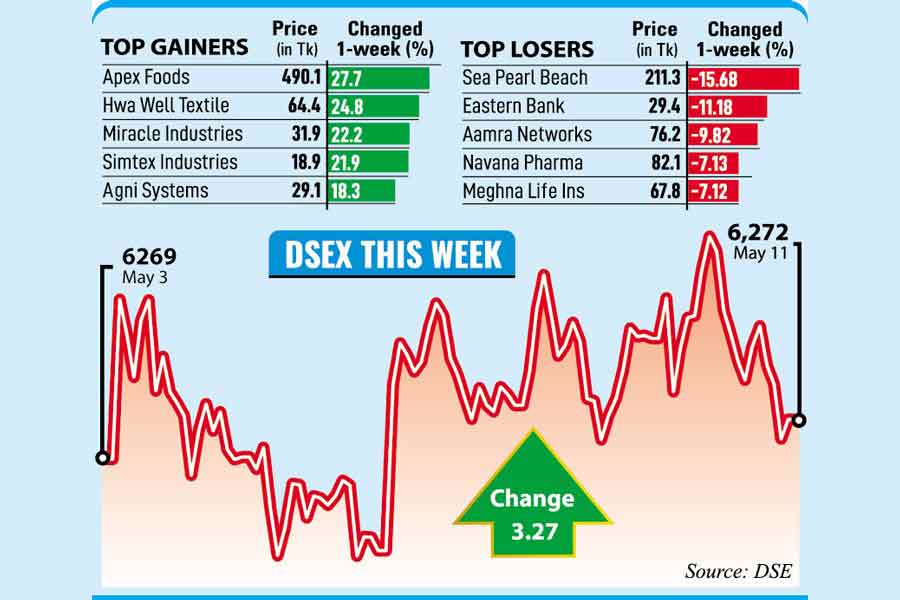 The week saw five trading days as usual with three sessions edging up while two others closed in the red. DSEX, the prime index of the Dhaka Stock Exchange (DSE), went up 3.27 points to settle the week at 6,272.43, after losing 4.88 points the week before.