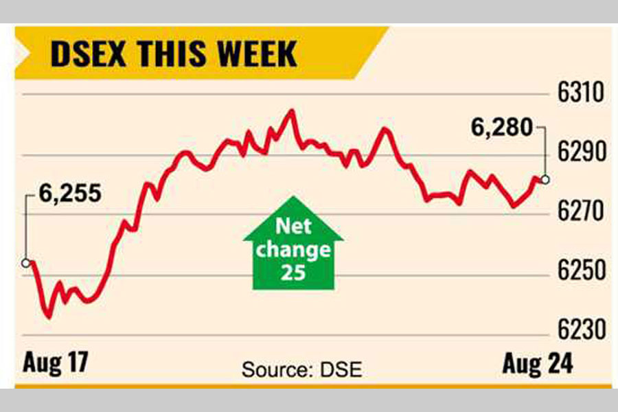 DSEX, the broad index of DSE, finally settled the week 25 points higher at 6280, as the majority of the sectors experienced marginal appreciation.