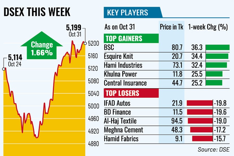 Substantial price surge of large-cap stocks, including blue chips, helped the benchmark index of the Dhaka Stock Exchange (DSE), surged almost 85 points or 1.66 per cent to settle the week at 5,199, after losing 616 points in the past five straight weeks.