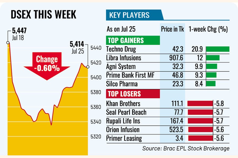 DESX, the benchmark index of the Dhaka Stock Exchange (DSE), finally slid almost 33 points or 0.60 per cent to settle at 5,414 on Thursday. The DSEX lost a total of 93 points in the past two straight weeks.