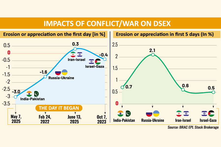 For example, the DSEX shed 149 points on the day the latest India-Pakistan conflict erupted on May7. But within five days, the DSEX recovered a loss of 33 points.