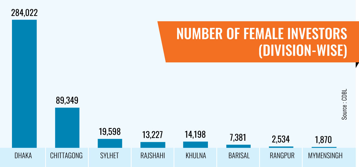 Women in Dhaka invest nearly 65 per cent, followed by Chattogram at around 21 per cent, according to CDBL data.
