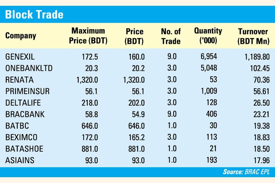 Block trade contributed more than 16 per cent to the total daily turnover, where stocks like Genex Infosys (Tk 1.19 billion), ONE Bank (102 million), Renata (Tk 70.35 million) and Prime Insurance (Tk 56.60 million) dominated the block trade board.