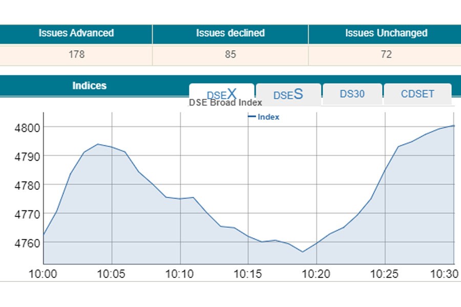 DSEX, the prime index of the DSE, went up by 38.18 points or 0.80 per cent to reach 4,801 points at 10:30am.