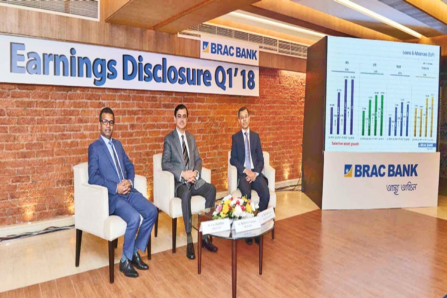 BRAC Bank Managing Director and Chief Executive Officer Selim RF Hussain, Deputy Managing Director and Chief Financial Officer A K Joaddar and Head of Treasury and FI Md Shaheen Iqbal seen at the bank’s earnings disclosure programme in the city on Thursday