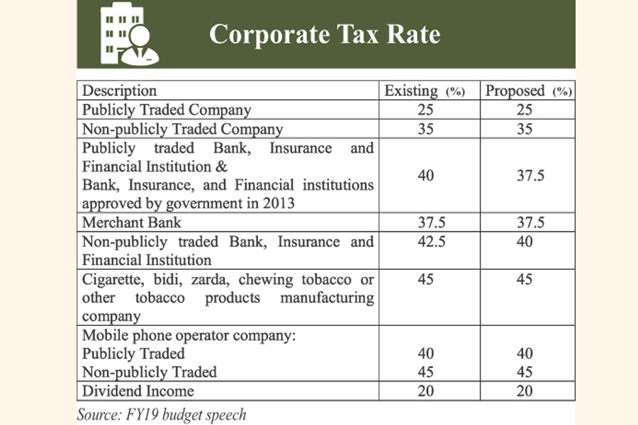 Placing the national budget for fiscal year (FY) 2018-19, Finance Minister AMA Muhith proposed to reduce the rate to 37.50 per cent from existing 40 per cent for publicly traded banks, insurance companies and financial institutions.