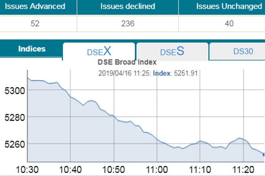 During the time, the DSE broad index DSEX lost 55.50 points to stand at 5253.96 points.