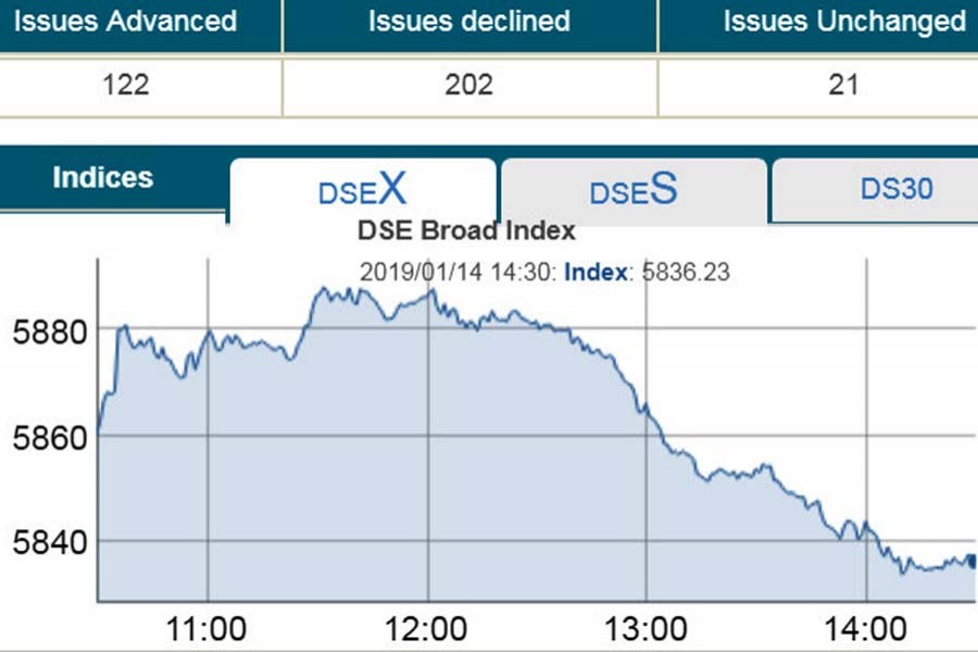 At the end of the session, the DSEX closed at 5836.23 points with a loss of 0.40 per cent or 23.98 points while the shariah based index DSES declined 0.24 per cent or 3.28 points to close at 1326.58 points.