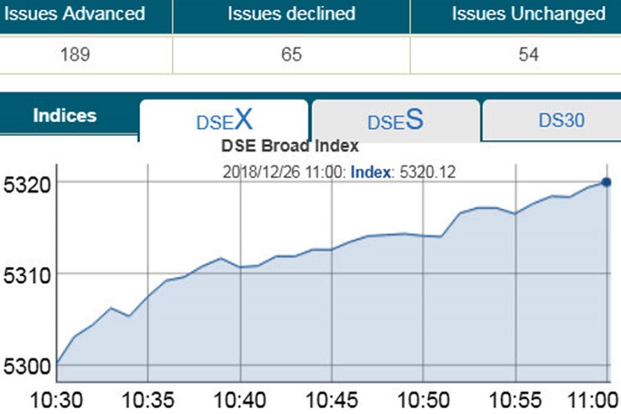 DSEX, the prime index of the DSE, went up by 19.11 points or 0.36 per cent to stand 5,319 points at 11:00am.