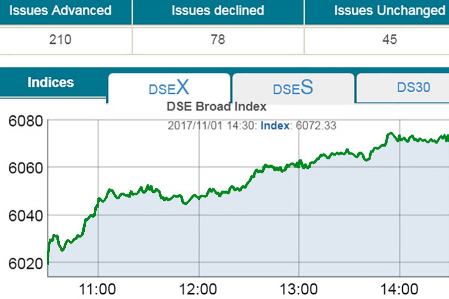 DSEX, the core index of the Dhaka Stock Exchange (DSE), settled at 6,072 points, after advancing 52.74 points or 0.87 per cent over the previous session.