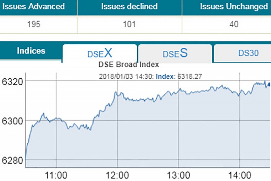 DSEX, the prime index of the Dhaka Stock Exchange (DSE), went up by 38.30 points or 0.60 per cent to settle at 6,318.