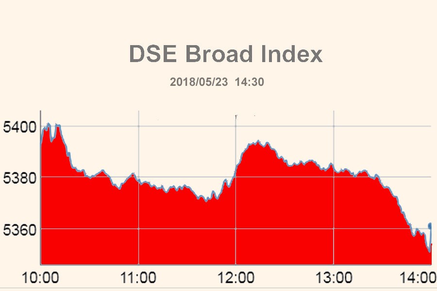 DSEX, core index of Dhaka Stock Exchange (DSE), went down by 30.79 points or 0.57 per cent to settle at 5,361 points.