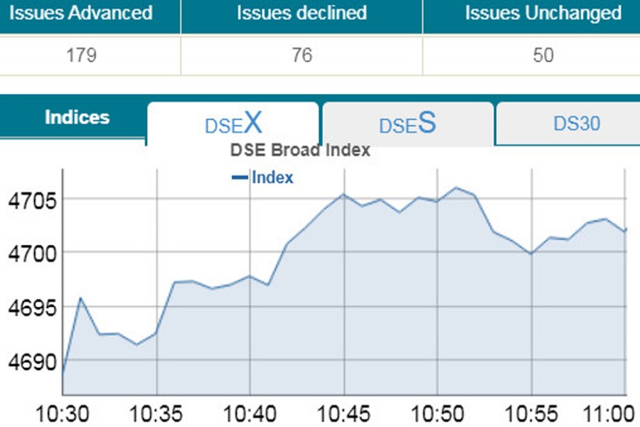 DSEX, the prime index of the DSE, went up by 13.55 points or 0.28 per cent to stand at 4,701 points at 11:00am.