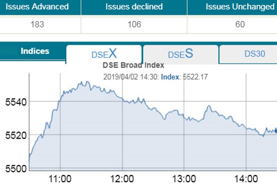 At the end of the session, DSEX, the prime index of the Dhaka Stock Exchange (DSE), went up by 19.09 points or 0.34 per cent to settle at 5,522.