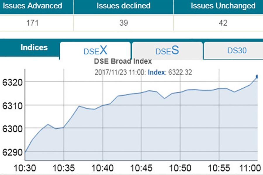 Two other indices saw a positive trend till then. Of them, DS30 index comprising blue chips advanced 11.38 points or 0.50 per cent to 2,282 and DSE Shariah index DSES also gained 8.18 points or 0.58 per cent to 1,398 points at 11:00am.
