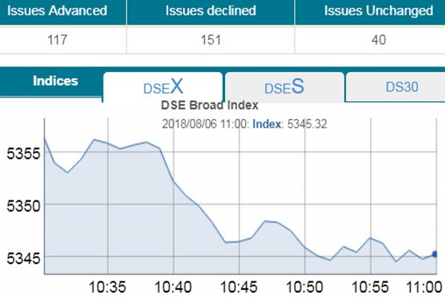 DSEX, the prime index of the DSE, went down by 12 points or 0.22 per cent to reach at 5,345 points at 11:00am.