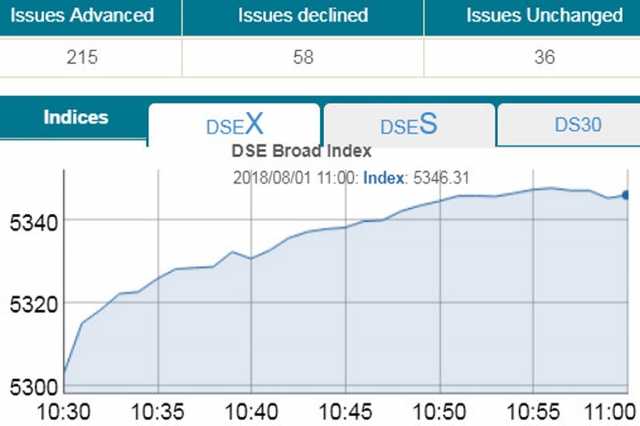 DSEX, the prime index of the DSE, went up by 45.20 points or 0.85 per cent to reach at 5,347 points at 11:00am.