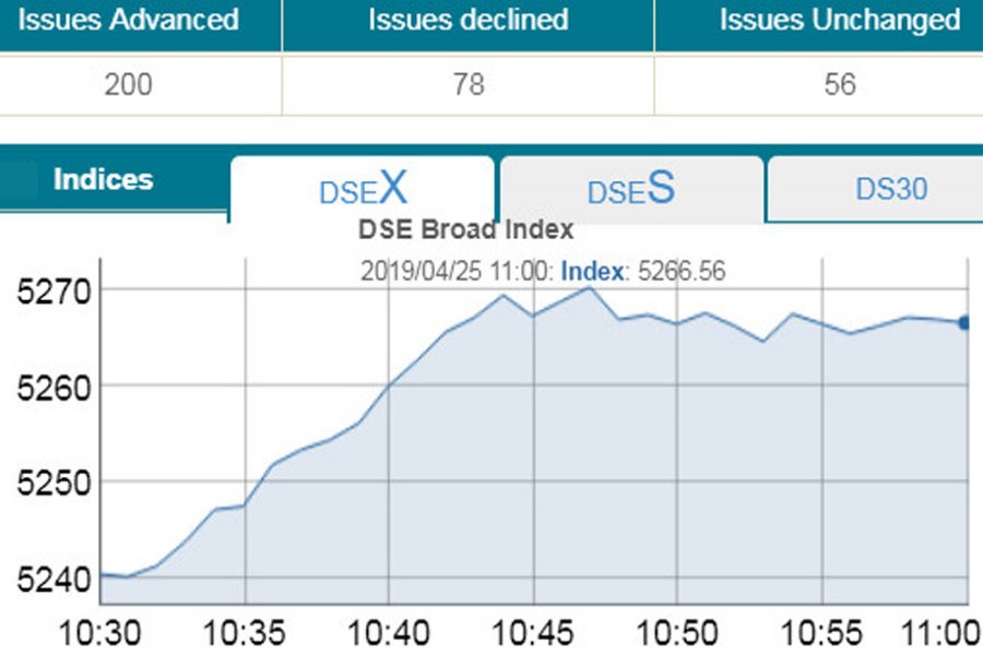 DSEX, the prime index of the DSE, went up by 9.90 points or 0.18 per cent to reach at 5,250 points at 11:30am.