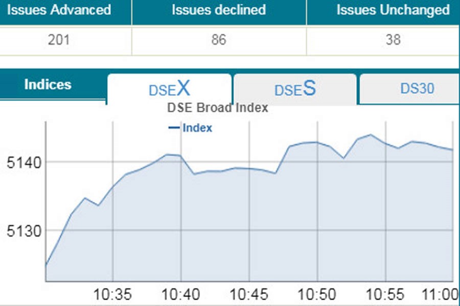 DSEX, the prime index of the DSE, went up by 17.31 points or 0.33 per cent to stand 5,141 points at 11:00am.