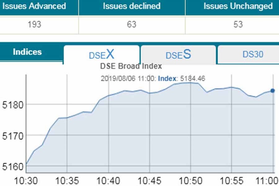 DSEX, the prime index of the DSE, went up by 22.28 points or 0.43 per cent to stand 5,182 points at 11:00am.