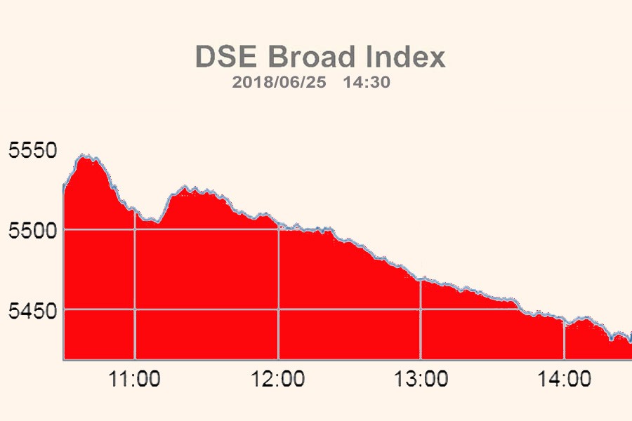 DSEX, the prime index of the Dhaka Stock Exchange (DSE), went down by 88 points or 1.59 per cent to settle at 5,433, after gaining 181 points in the past four straight sessions.