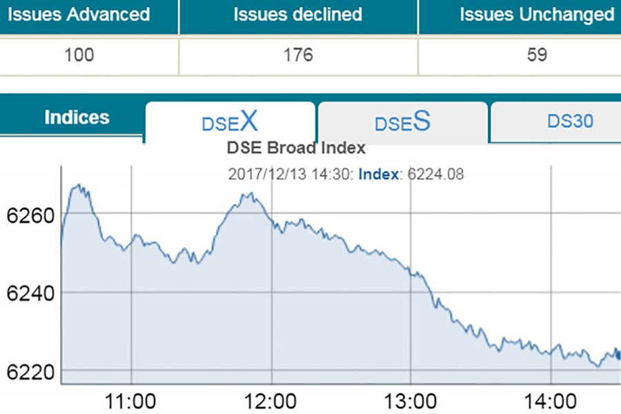 DSEX, the core index of the Dhaka Stock Exchange (DSE), went down by 27.52 points or 0.44 per cent to settle at 6,224.