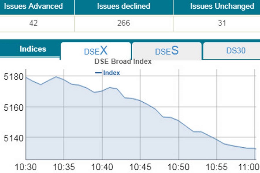 DSEX, the prime index of the DSE, went down by 43.46 points or 0.83 per cent to stand 5,136 points at 11:00am.