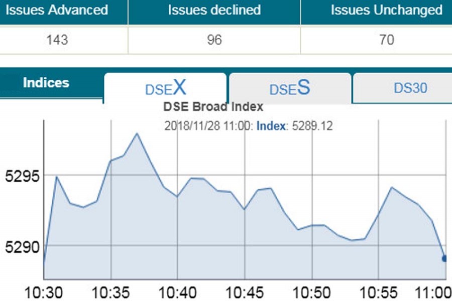 DSEX, the prime index of the DSE, went up by 0.42 points to stand 5,288 points at 11:00am.