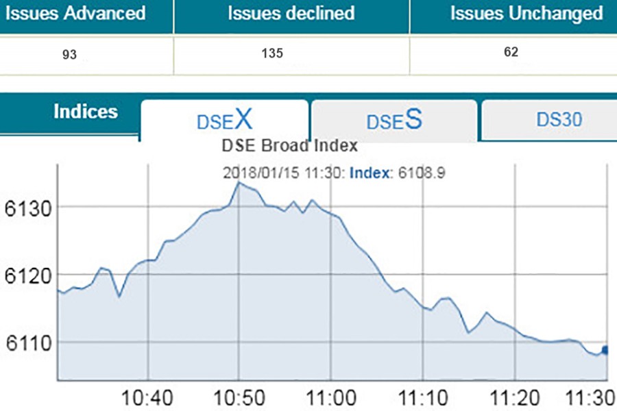 DSEX, the prime index of the DSE, went down by 8.99 points or 0.14 per cent to reach at 6,109 points at 11:30am.